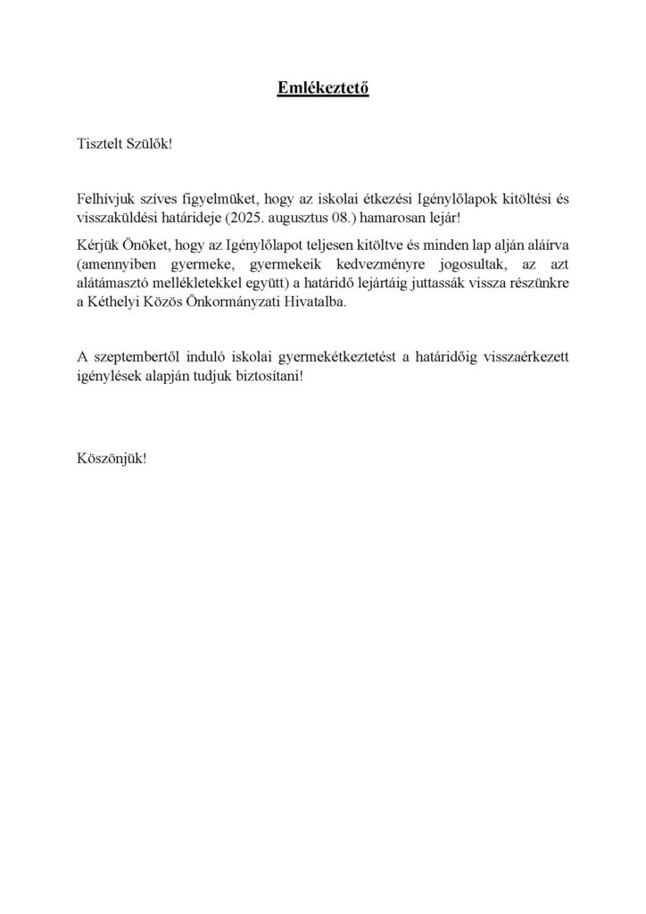 Kezdőlap - Nyomtatványok - Hírek - Emlékeztető! iskolai étkeztetés igénylése.