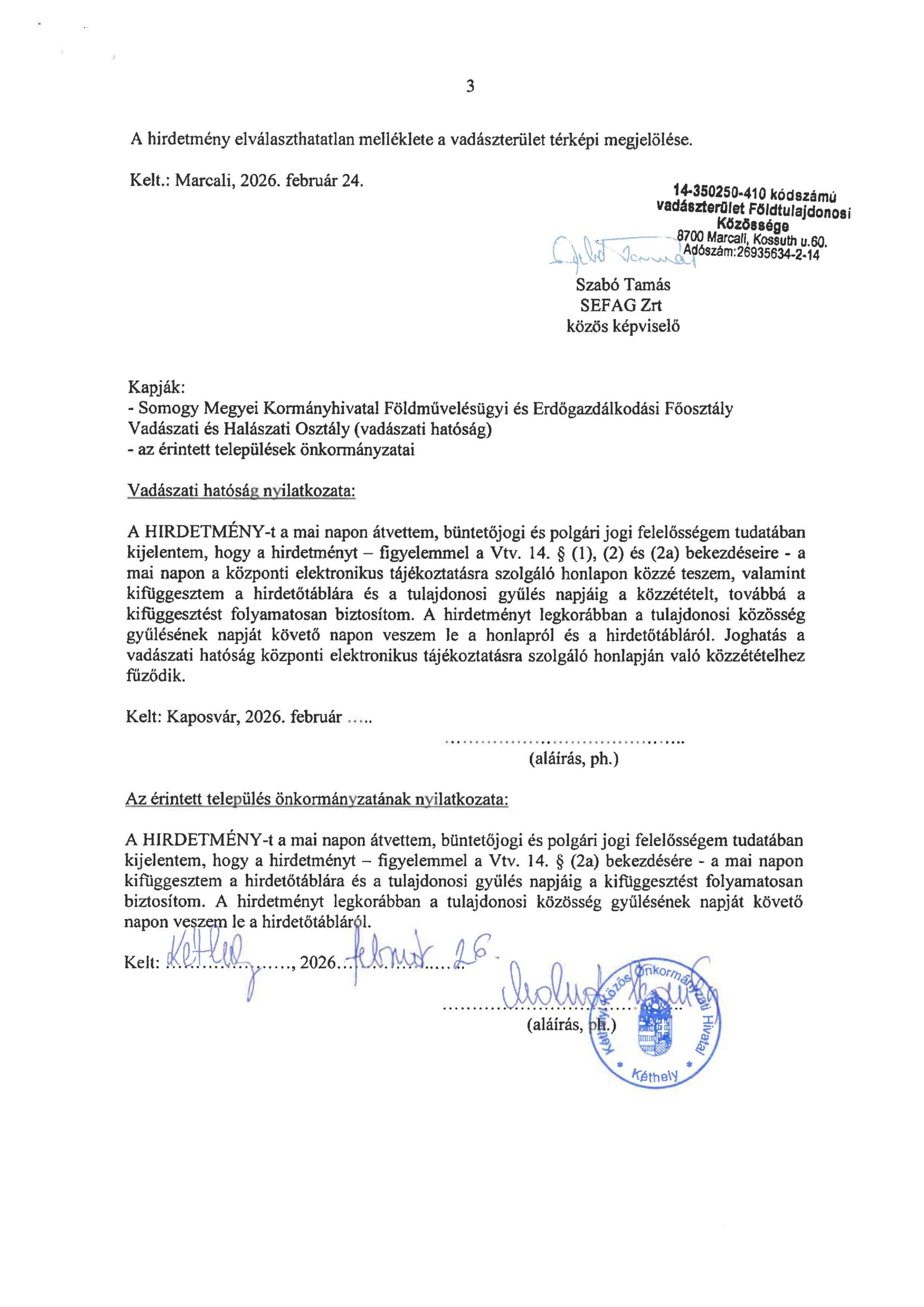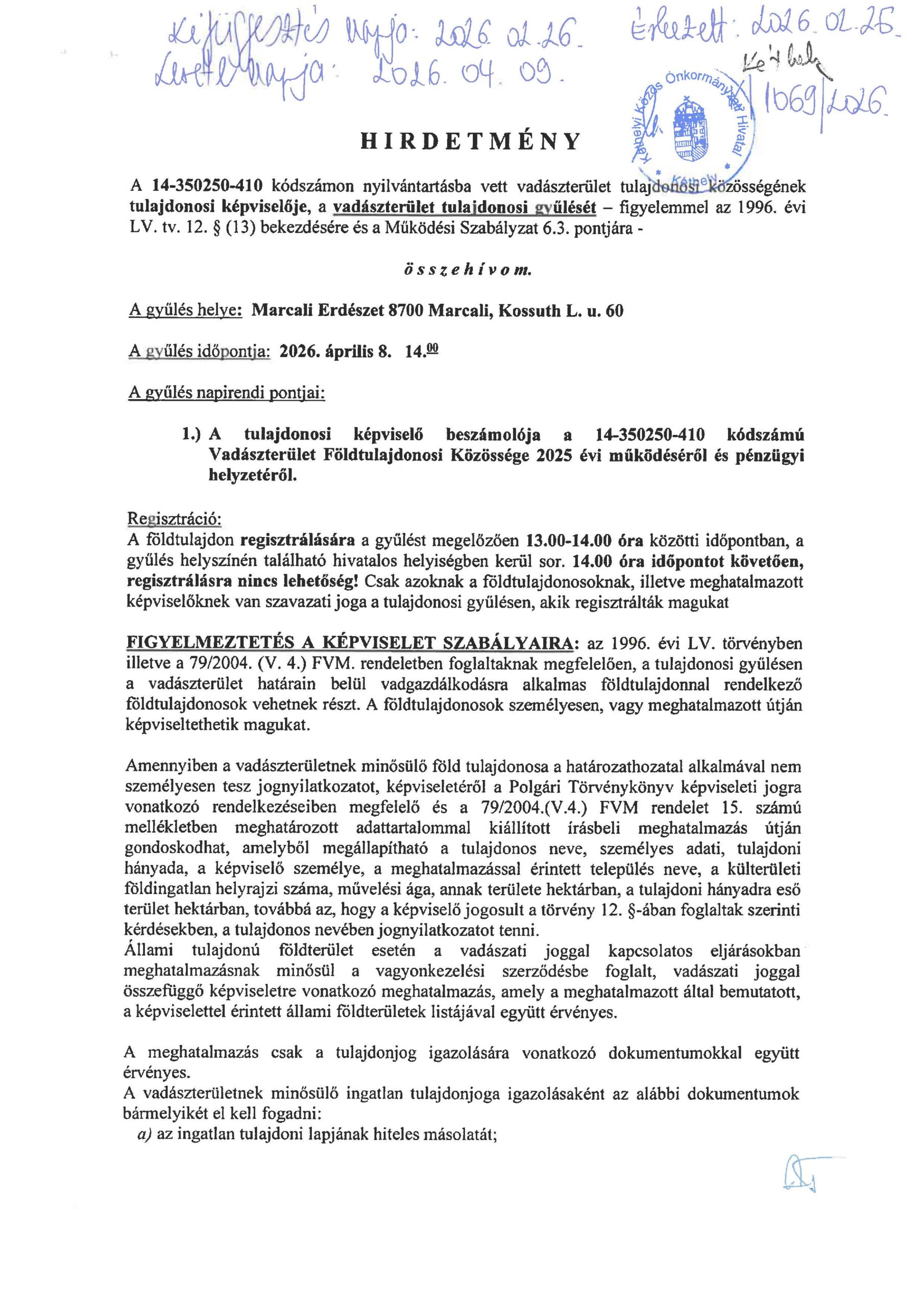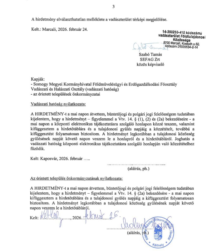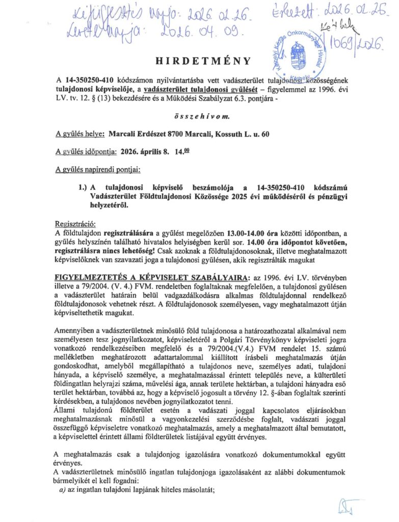 Kezdőlap - Nyomtatványok - Hírek - Hirdetmény! Vadászterület tulajdonosi gyűlése. 2026.04.08.