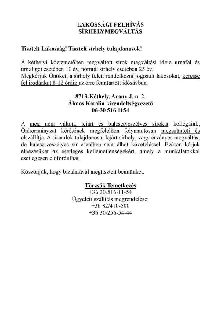 Kezdőlap - Nyomtatványok - Hírek - Lakossági Felhívás! Sírhelymegváltás