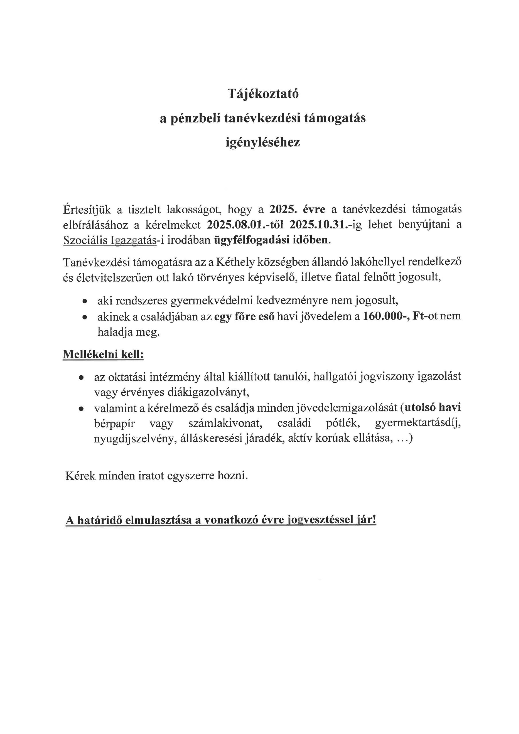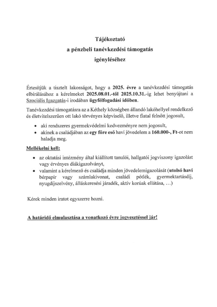 Tájékoztató! Tanévkezdési támogatás igényléséhez